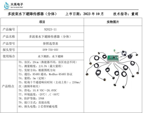 產品選型:綜上所述,經和客戶、公司技術溝通交流后,產品選用制造商為:福州大禹電子科技有限公司定制生產的:分體式水下避障傳感器(10波束電路板),接4路探頭(和電路板做快插連接,200KHz探頭,每只探頭1.5米長線纜),電路板集成到水下機器人內部做好防水封裝,配50米線纜,線纜從機器人頂部穿出來防水封裝,另一端做快插接頭和手持式顯示主機或電腦上位機軟件顯示出前、后、左、右分別的距離值和水下溫度;